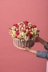 Корзина которая собрала в себя всю любовь, прекрасные оттенки ярко-розового цвета и нежнейшей хризантемы. Клубника в шоколаде марки Callebaut придает ягодам сладкие, изысканные нотки настоящего шоколада родом из Бельгии